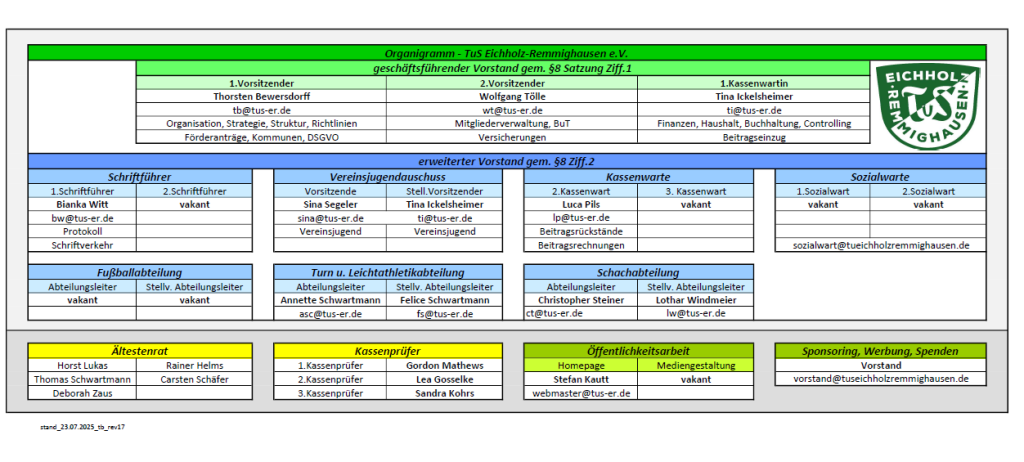 Etwa 400 Jugendliche sind Mitglied in unserem Sportverein. Die Vereinsjugendleitung (VJL) des TuS Eichholz-Remmighausen e.V. versteht sich als Bindeglied zwischen den Kinder- und Jugendabteilungen und dem Vorstand unseres Vereins. Fast jede Abteilung hat in der VJL eine/n zugeteilte/n Ansprechpartner/in, den/die Ihr jederzeit gerne ansprechen könnt.