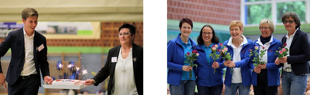 Natürlich wurde auch vor der Siegerehrung stilvoll der runde Geburtstag der 20. Veranstaltung gefeiert. Zur Überraschung gab es von allen 22 Kampfrichterinnen für die Damen des Turngaus rote Rosen und eine funkensprühende Geburtstagstorte – das war eine tolle Idee.