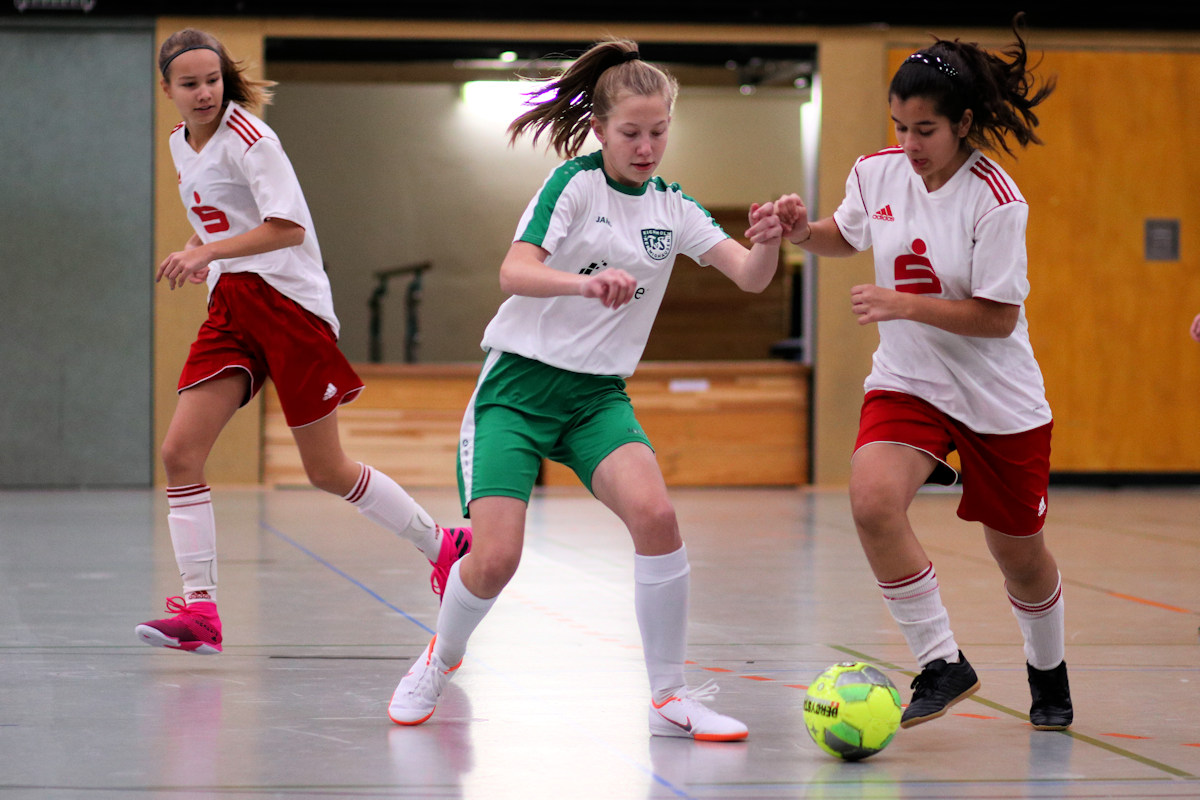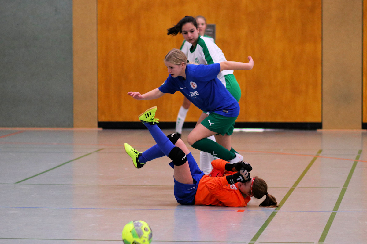 Der Kreis Lemgo richtete das Turnier in der Sporthalle Lohfeld in Bad Salzuflen aus. Die mittlerweile schon als langjährig zu bezeichnender Freundschaft zwischen den Eichholzer Juniorinnen und der Lemgoer Mädchen-Kreisauswahl trägt nachhaltig Früchte. An dieser Stelle ein herzlicher Dank an Thorsten Schlüter, der uns mit seiner Einladung zum Turnier dieses großartige Hallenevent ermöglichte. Mit äußerst knapper Besetzung (2 Wechselspielerinnen) reiste unser Trainerteam Andreas/Naroz pünktlich am Sonntag früh an. Da die Lemgoer Auswahl mit zwei Mannschaften antrat, konnten unsere Nachbarn auch mit internen Wechseln für die nötigen Ruhephasen der Kickerinnen sorgen. Die Personalstärke der Auswahlteams Bielefeld (10) und Münster (12) war darüber hinaus wirklich sehr beeindruckend. Der Modus Jeder gegen Jeden bei einer Spielzeit von 2 x 10 Minuten würde für die Eichholzer Mädels sicher die größte Kraft- und Ausdauerherausforderung werden. Überaus komfortable Entlastungsmöglichkeiten hatte Münster: mit insgesamt 12 Spielerinnen stellte der spätere Turniersieger 3 komplette 4-er Blöcke. Mit geschickter Wechselstrategie konnten alle mit gleichen Spielzeiten, aber auch genügend Ruhephasen ihr fußballerisches Können zeigen. Und das taten die Münsteraner dann auch – hochverdient und unangefochten gewannen sie mit 4 Siegen das Turnier.
