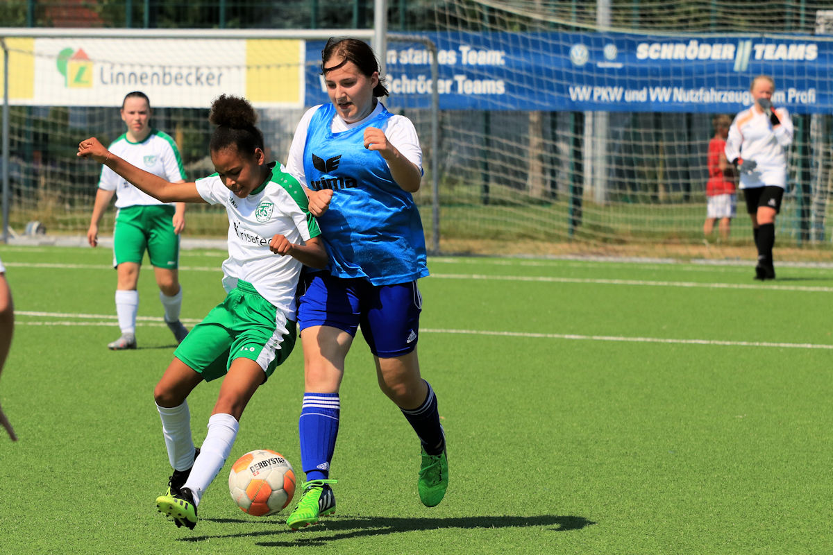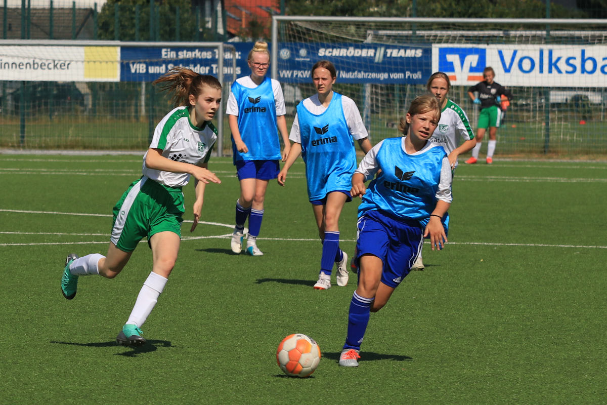 Keine 24 Stunden Erholung gönnten die Eichholzer Betreuer den Mädels. Nach dem Sieg gegen Bielefeld reisten die Grün-Weißen mit großem Anhang am frühen Sonntag Vormittag zum VfB Schloß Holte. Auf der herrlichen Anlage des VfB war Bilderbuchwetter angesagt, vielleicht ein paar Grad zu viel… dafür gabs an der blau-weißen Hütte Kaffee, Kaltgetränke und weiteres vorzügliches Catering Angebot. Dass die Grün-Weißen einen derartigen Rhythmus mit hoher Schlagzahl an Testspielen verkraften können, zeigten sie schon oft in den Vorbereitungszeiten der letzten Jahre. Stammkeeper Jannika stand an diesem Tage leider nicht zur Verfügung. Sie wurde wieder einmal hervorragend vertreten vom Duo Aliana/Madleen. Vom Anstoß weg übernahm der TuS die Regie auf dem Feld. Mit schnellen Spielzügen und guten Bällen in die Spitze erarbeitete sich Eichholz eine Vielzahl von erfolgversprechenden Angriffen.