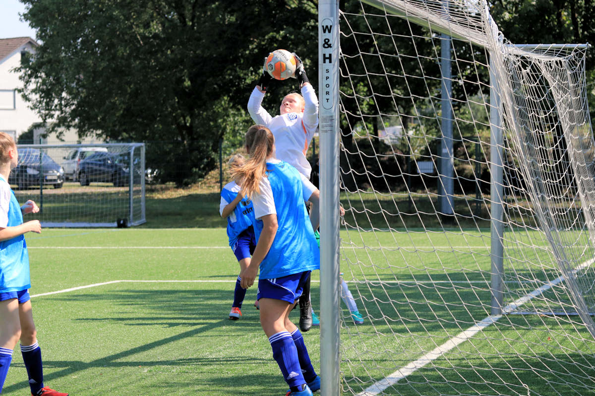 Wie im Vorfeld abgesprochen, übergab Aliana, die nur einmal eingreifen musste, die Keeper-Handschuhe an Medleen. Schon jetzt darf verraten werden, dass auch Madleen nur einen Ball zu entschärfen hatte. Ansonsten beschränkten sich ihre Ballkontakte auf Rückgaben, nach denen sie gemeinsam mit ihren Vorderleuten das Aufbauspiel startete. Auch auf den Positionen im Feld wurde über die gesamte Spielzeit fleißig durchgewechselt. Andreas und Tobi achteten darauf, dass bei der Dauerbelastung (3 Spiele innerhalb von 4 Tagen) die Spielerinnen auch während der Partien genügend Ruhephasen bekamen. Der zweite Durchgang startete, Eichholz erwartete die Blau-Weißen nun offensiver. Den Bemühungen des VfB ihre Offensive zu forcieren setzten die Eichholzer Mädels schnell Grenzen auf.