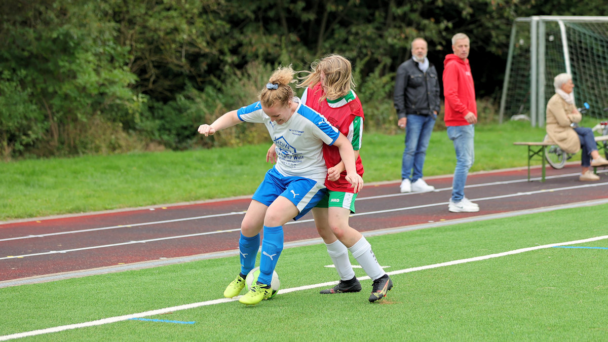 In der 6ten Minute preschte Jule über die rechte Seite bis zur Grundlinie durch, und legte perfekt an den Elfmeterpunkt zurück. Alexa fackelte nicht lange und schoss sicher zum 1:0 ein. Eichholz machte weiter Druck und erspielte sich einige sehenswerte Angriffe. Das beruhigende zweite Tor wollte zunächst nicht gelingen. In der 36sten Minute tankte sich Xenia über rechts außen durch und zog fast ungehindert in den 16er.