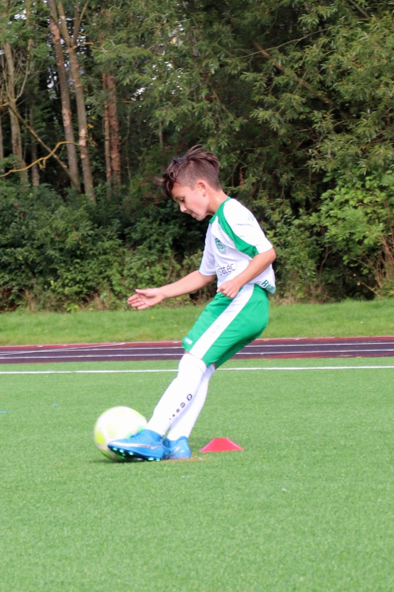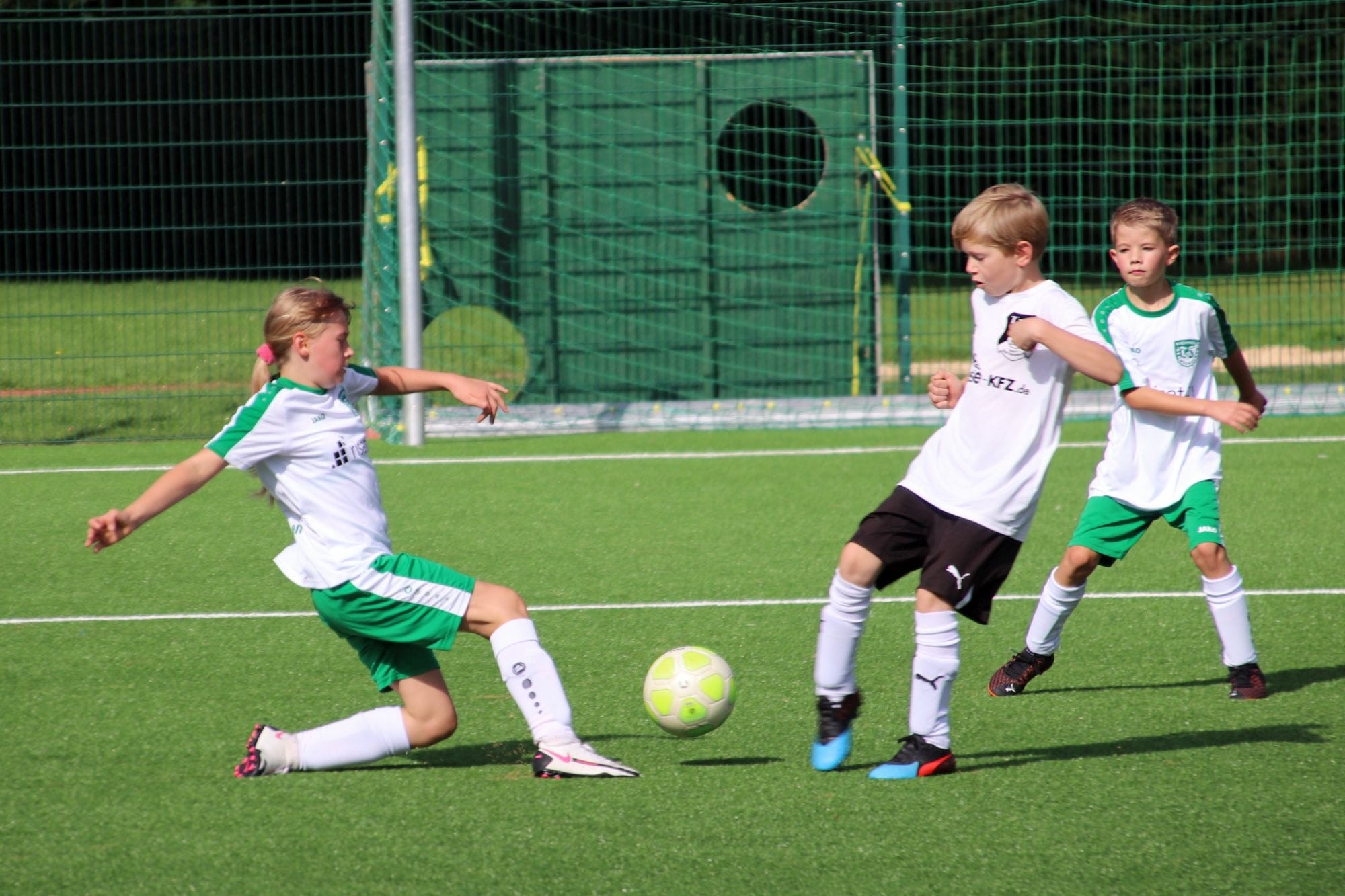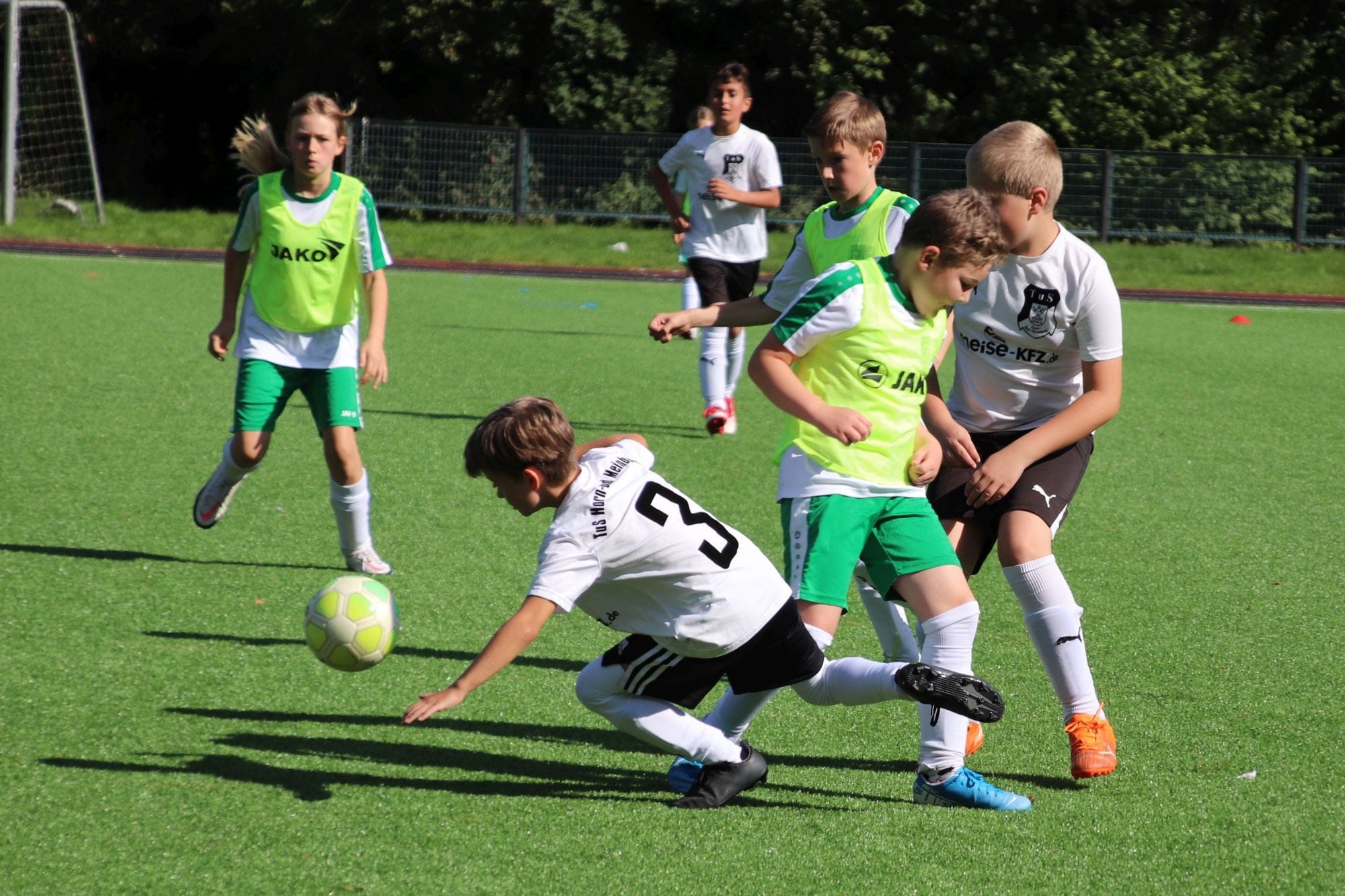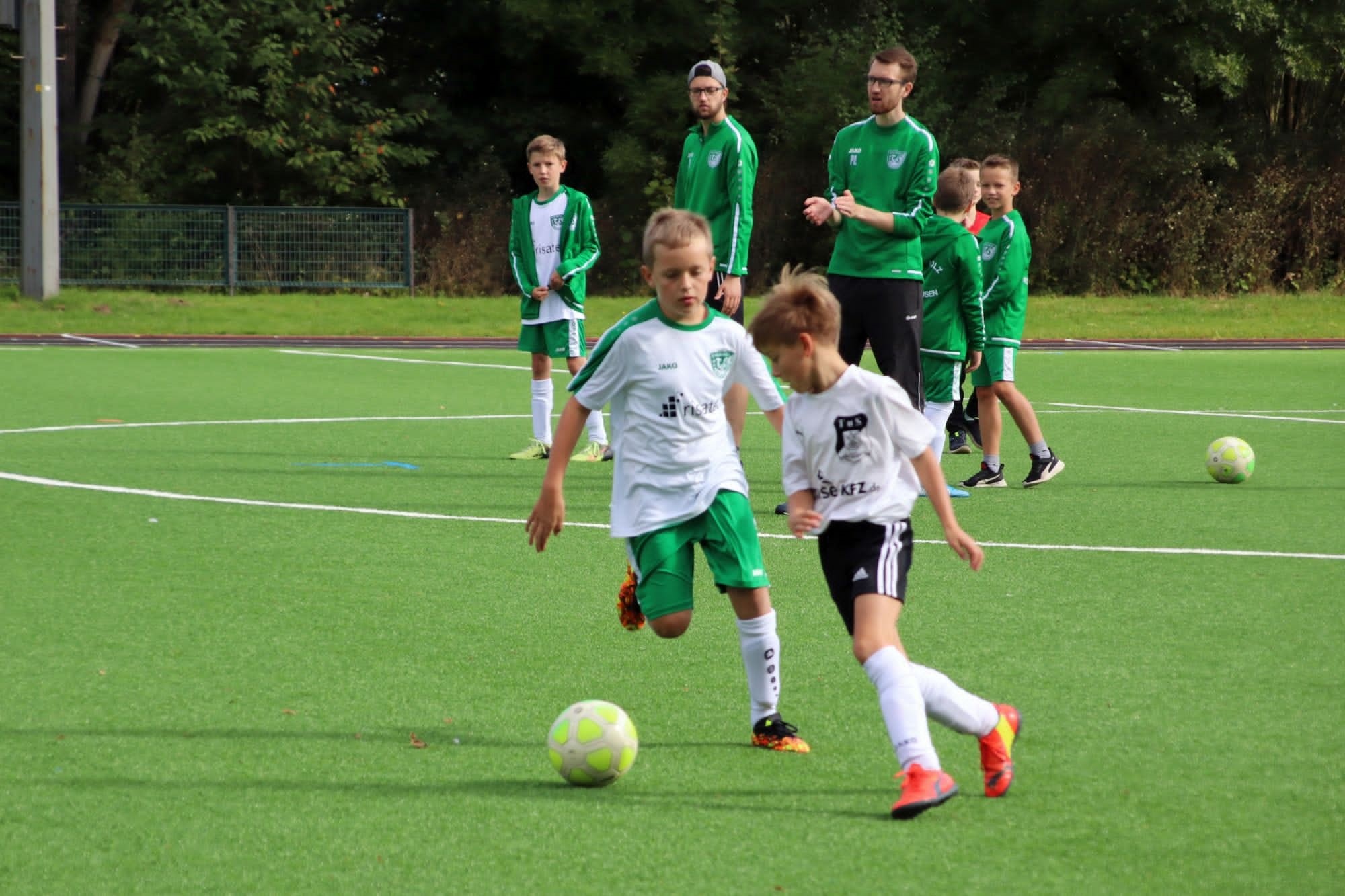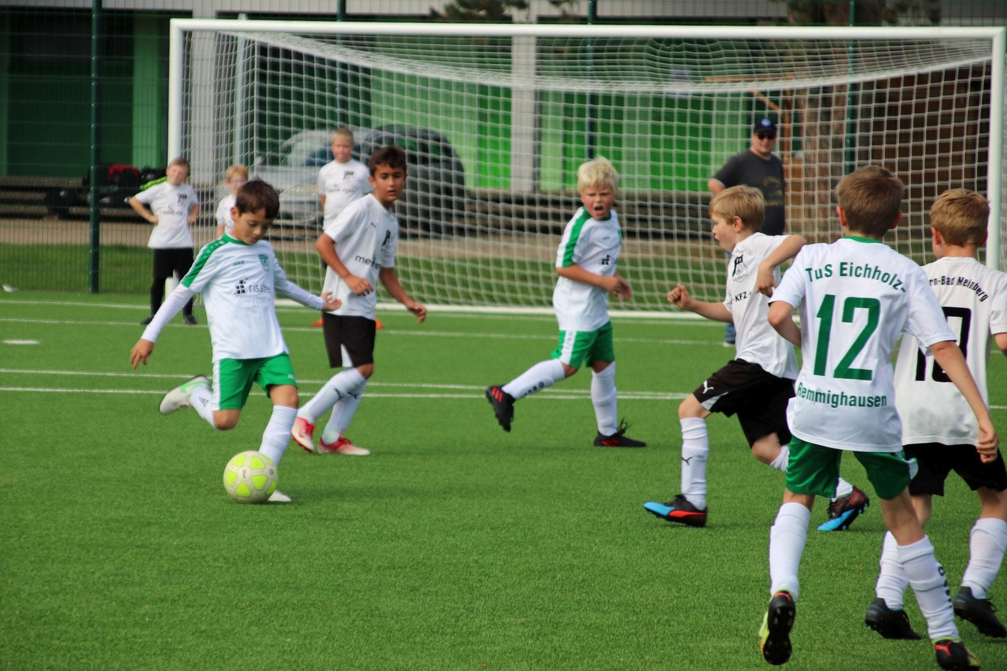 Bei bestem Fußballwetter unternahm unsere E2 am Samstagvormittag einen neuen Versuch, um den ersten Saisonsieg einzufahren, zu Gast war der TuS Horn-Bad Meinberg. In der ersten Viertelstunde tasteten sich beide Teams noch weitestgehend ab, ohne wirklich zwingend zu werden. Dann aber nahmen die Gäste zusehends das Heft in die Hand und näherten sich dem Tor gleich mehrfach gefährlich. Gut für unser Team, dass unsere Torhüterin bestens aufgelegt war und mutig diverse Schüsse der TuS-Angreifer parierte. Kurz vor der Pause war aber auch sie machtlos, als es zum ersten Mal nahe dem Torwinkel im Gehäuse einschlug. Es drohte ein ähnlicher Verlauf wie in den vorangegangenen Spielen, umso mehr noch, als die Gäste im weiteren Verlauf auf 0:2 erhöhen konnten. Zur Mitte der 2. Hälfte legten unsere Mädels und Jungs dann jedoch den Schalter um und setzten sich immer mehr am gegnerischen Strafraum fest. Dabei fehlte es ein ums andere Mal nur am finalen Pass, um zu einer vielversprechenden Abschlusssituation zu kommen. Dann aber überrumpelten unsere Kicker den Gegner mit einem schnell ausgeführten Einwurf in die Gasse, der per Direktabnahme am herausstürzenden Horner Keeper erfolgreich abgeschlossen werden konnte. Dies setzte neue Kräfte frei und nur wenig später fiel folgerichtig nach einer schönen Kombination über die rechte Seite der Ausgleich. Und plötzlich lag sogar noch mehr in der Luft, unsere Mannschaft kombinierte sich mehrfach vor den Augen der begeisterten Zuschauer durch, konnte den Ball allerdings nicht noch einmal im Tor unterbringen. Stattdessen kamen die Horner noch einmal vor das Eichholzer Tor und versenkten die Kugel kurz vor dem Ende unhaltbar zum 2:3. Trotz der erneuten Niederlage konnte unser Trainer-Duo viel Positives mit aus dem Spiel nehmen und auch unser Team konnte durch den rasanten Spielverlauf Selbstvertrauen tanken.