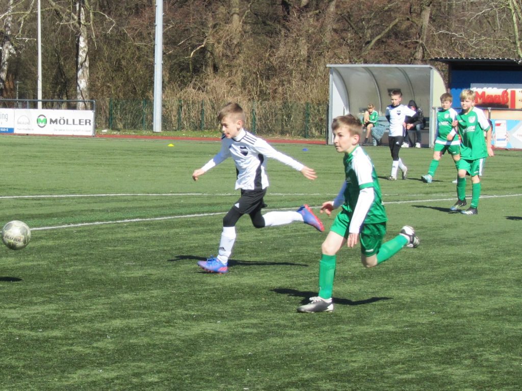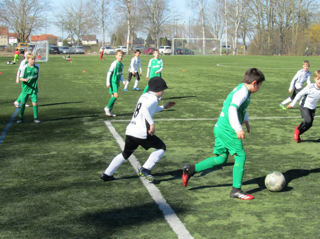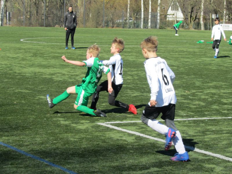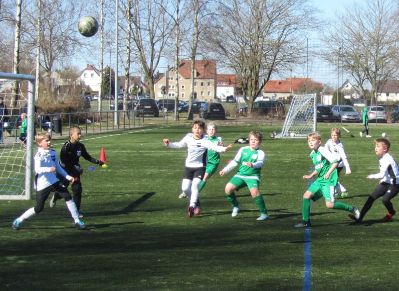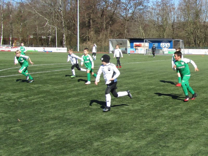 Die Partie begann sehr diszipliniert auf beiden Seiten, mit hoher Positionstreue und wenig Raum zum Fußball spielen. Beide Mannschaften verstanden es den Gegner unter Druck zu setzen und nicht ins Spiel kommen zu lassen. So waren es individuelle Kleinigkeiten, die das Spiel heute entscheiden sollten. Gefühlt gelang es unserer Mannschaft besser, den Gegner in der eigenen Hälfte zu binden. In der 4. Minute wurde das auch belohnt, mit der 1:0 Führung. Zu diesem Zeitpunkt nicht hochverdient, aber im Gegensatz zur Vorwoche nutzten wir eine der ersten Chancen eiskalt aus. Im Anschluss wurde das Spiel dann offener und der Gastgeber kam besser ins Spiel. Grün/Weiß war defensiv gefordert und musste hohen Aufwand betreiben den Gegner vom eigenen Gehäuse fernzuhalten. In der 10. Minute fiel der Ausgleichstreffer, der sich jetzt nicht unbedingt angekündigt hatte aber Jerxen hat natürlich die Klasse jederzeit ein Tor zu erzielen. 3 Minuten später konnten wir die Antwort mit der erneuten Führung geben, was der Gastgeber aber wieder 3 Minuten später egalisieren konnte. Kurz vor dem Pausentee (21. Minute) konnte unser Team dann sehenswert auf 3:2 erhöhen. Nach einem Ballgewinn in der gegnerischen Hälfte und einer schnell gespielten Passage konnte der Gastgeber den Einschlag nicht mehr verhindern. Dies war dann auch der Halbzeitstand.