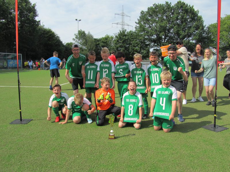 Unsere E-Jugend gewinnt den Sparkassen-Cup 2022! Das zweitägige Turnier, ausgerichtet vom SV Ubbedissen 09, mit Mannschaften aus dem Fußballkreis Bielefeld und Umland, startete am Samstag mit einer Qualifikationsrunde und am Sonntag wurde die Finalrunde gespielt. Bei unglaublicher Hitze am Samstag musste sich unser Team mit den Sportfreunden Sennestadt, dem TuS Quelle, dem VfR Wellensiek und dem SV Ubbedissen 09 messen. Keine leichte Aufgabe für alle Teilnehmer aber unsere Mannschaft konnte die Hürde überwinden und sich einen der begehrten Startplätze für die Finalrunde sichern. In der Formkurve blieb an diesem Tag aber noch Luft nach oben. Trotzdem war die Freude groß, die Anreise am nächsten Tag erneut antreten zu dürfen. Von den ursprünglich geplanten 16 Mannschaften, nahmen 12 an der Endrunde teil.