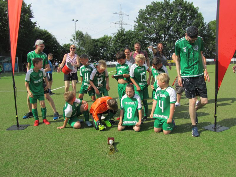 Anschließend mussten die zahlreich ausgegebenen Siegprämien abgearbeitet werden. Von Pizza bis zur Poolparty feierte die Mannschaft diesen Erfolg bis in den späten Abend. Natürlich konnten sich die Trainierenden und Spielenden einer Wasserdusche durch die Eltern nicht entziehen.
