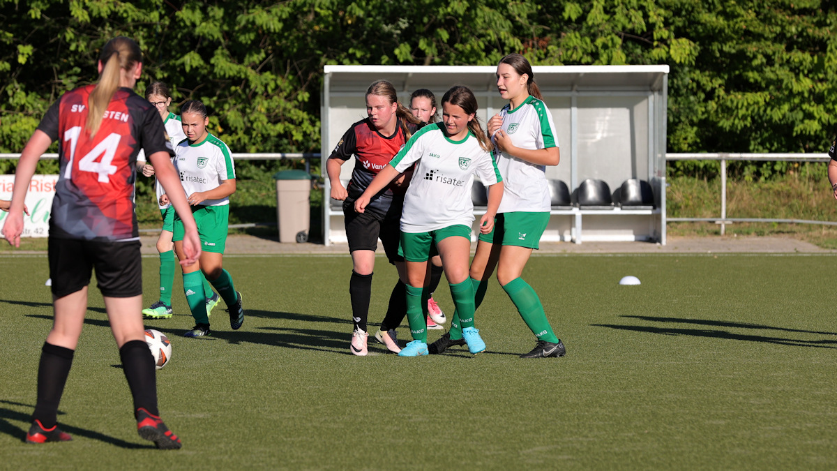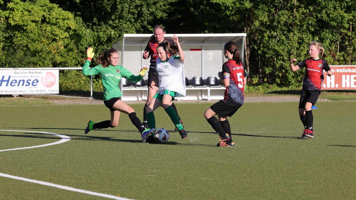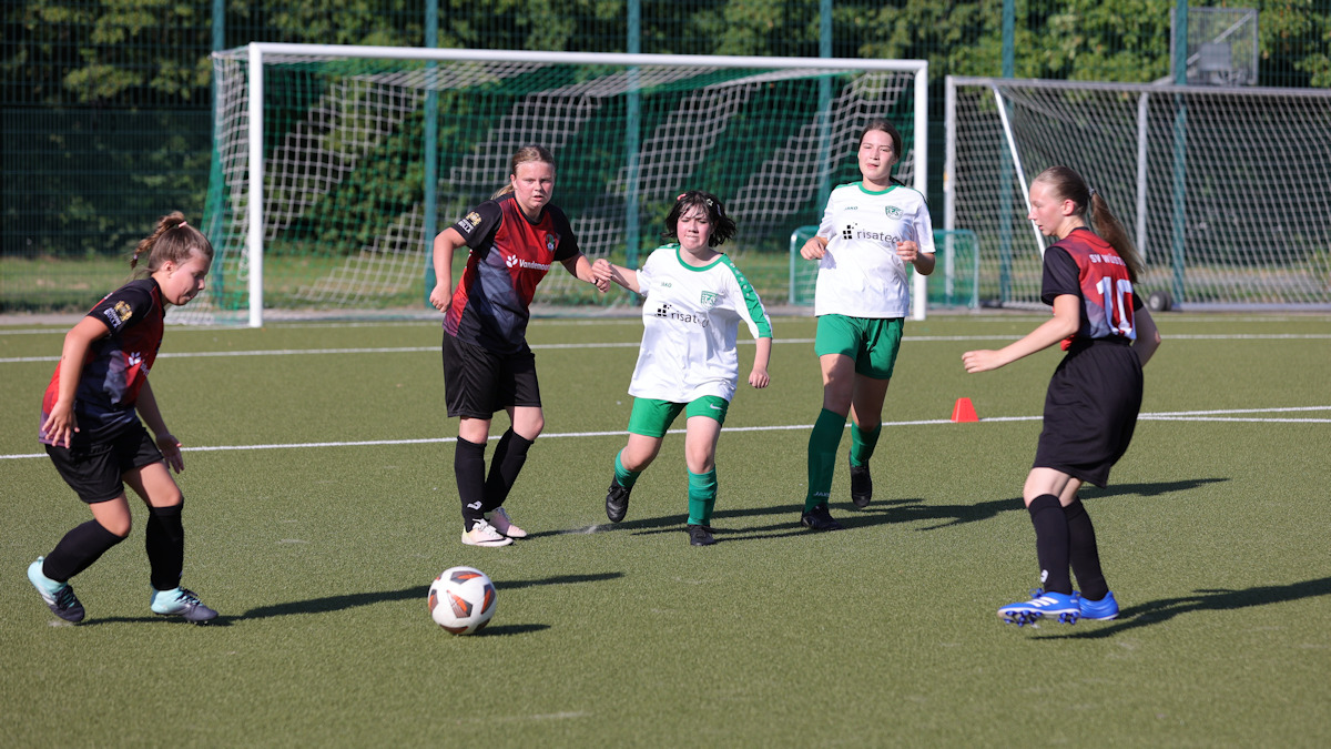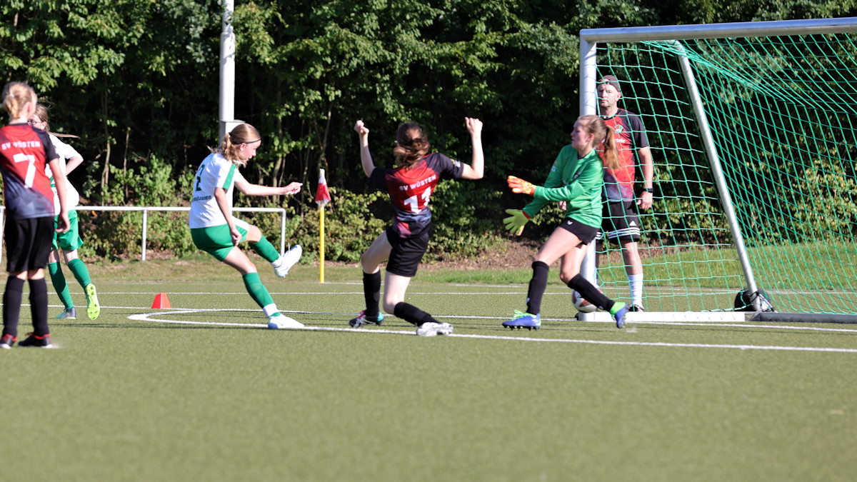 Natürlich waren die Mädels heiß auf dieses erste Vorbereitungsspiel, passend dazu stiftete der Wettergott Temperaturen von über 30 Grad… Beim SV Wüsten findet das neu gegründete Juniorinnenteam großes Interesse. Im Rahmen des aktuellen Sportfests lockte dieses Testspiel eine große Zuschauerkulisse an. Sehr zur Freude der Einheimischen kam der SV besser in die Partie, ging mit 1:0 in Front.