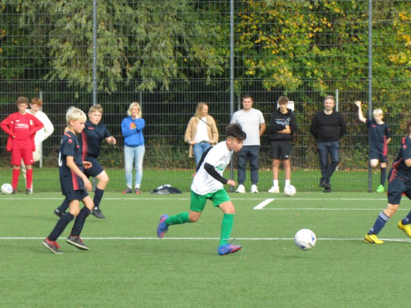 Grün/Weiß begann souverän, war bemüht um Ballbesitz und versuchte sich konzentriert Chancen zu erarbeiten. In der 6. Minute konnte dann Joris nach einem Eckball zum 1:0 den ersten Treffer für unsere Farben markieren. Anschließend spielte unsere Mannschaft freier auf, ohne den Fokus zu verlieren. In der 17. Minute traf Mico per Freistoß zum 2:0, eine Minute später konnte Adam auf 3:0 erhöhen und in der 27. Minute war es Jamie, der auf 4:0 erhöhen konnte womit es auch in die Halbzeitpause ging.