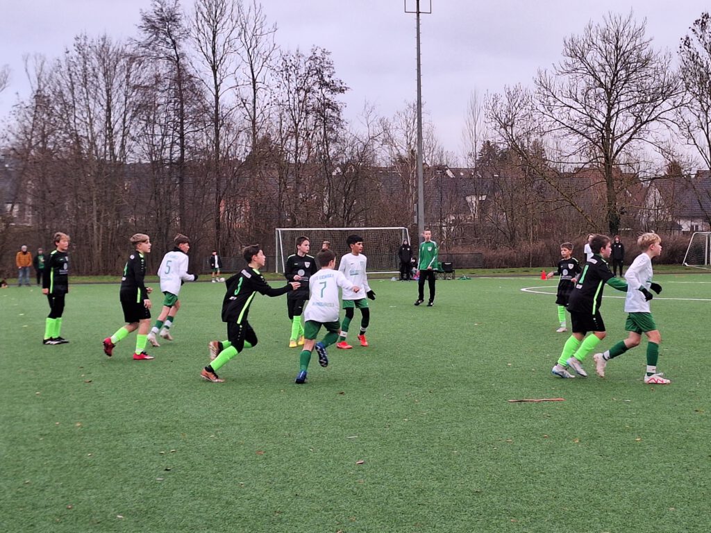 Am Donnerstag, den 14.12.2023, und Samstag, den 16.12.2023, muss die D-Mannschaft noch einmal ran, bevor es heißt, spielfrei und Weihnachtsferien. Der erste Gegner in dieser Woche ist die JSG Hiddesen-Heidenoldendorf. Ein Nachholspiel aufgrund des Wintereinbruchs im Kreis Lippe. Und diese wetterbedingte Pause hat den grün-weißen gar nicht gutgetan. Trotz eigenem Anstoß finden sie sehr schwer ins Spiel und nach kurzer Zeit fällt bereits das erste Tor für die Gegner. Es gibt Abstimmungsprobleme in der Abwehr und der Rückpass gerät zu kurz. Der Stürmer der JSG nimmt dankend an und vollendet zum 0:1. Im weiteren Verlauf der Partie findet die Abwehr immer noch nicht das richtige Rezept und es steht 0:2. Jetzt ist der TuS Eichholz-Remmighausen gefragt hier doch noch Punkte zu sammeln. Gewiss ein Spiel für die zusehenden Eltern, die es lieber spannend mögen. Aus einem Befreiungsschlag heraus fällt dann das 1:2. Joris kann die Gunst des langen Balls nutzen und verhilft der D-Jugend Mannschaft zur Initialzündung. Wo es vorher noch Probleme gab in das Spiel zu kommen, nimmt das Geschehen jetzt einen anderen Lauf. Es ist ebenfalls Joris der einen Elfmeter zum 2:2 verwandelt und mit diesem Spielstand geht es in die Pause. Der Aufwind wird in die zweite Halbzeit mitgenommen. Es ist spürbar, dass man sich hier nicht mit einem Unentschieden zufriedengeben will. Und so gelingt Joris das Tor zum 3:2. Der gut aufgelegte Torwart der JSG kann zwar mehrfach das Tor verhindern, muss sich aber wiederum Joris geschlagen geben, der zum 4:2 erhöht. Kurz vor Ende der Partie bleibt sich das Spiel dem Motto treu „spannend muss es sein“ und der JSG Hiddessen-Heidenoldendorf gelingt der Anschlusstreffer zum 4:3. Trotz aller Bemühungen und dank cleverer Spielweise trägt der TuS Eichholz-Remmighausen aber den Sieg über die Ziellinie.
