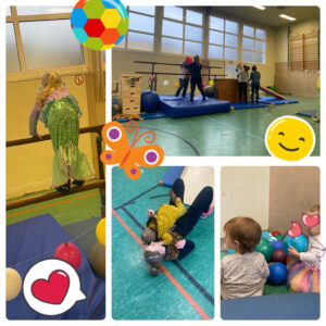 Zu Beginn wurde zu fetziger Karnevalsmusik ein Aufwärmtanz getanzt. Beim Fliegerlied waren alle sofort aktiv dabei und haben sofort begeistert mitgemacht. Danach konnten die Kinder, wie gewohnt, im zuvor aufgebauten Pacours toben und spielen.
