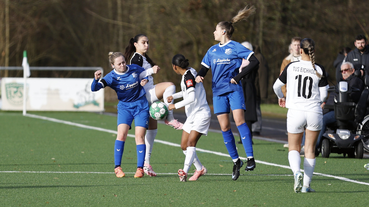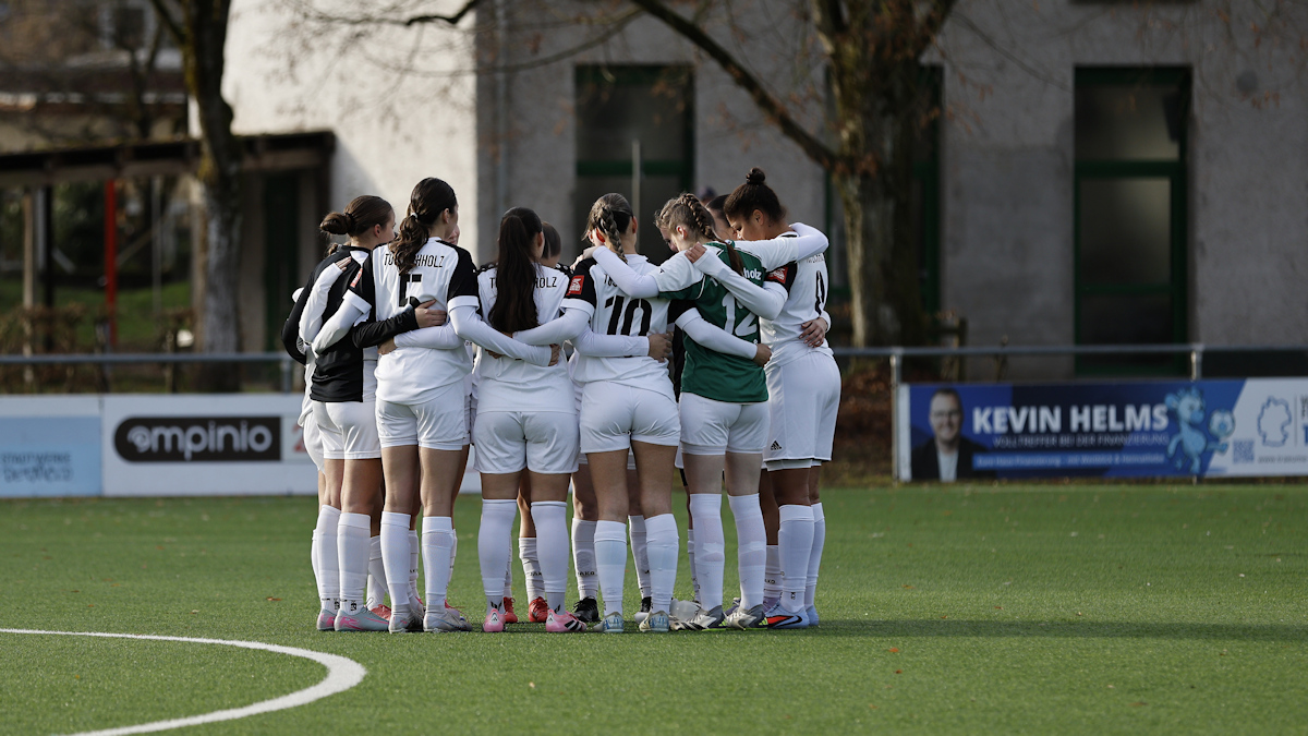 In der 72ten Minute zirkelte Jule Suermann eine ihrer brandgefährlichen Eckstöße auf den kurzen Pfosten. Obwohl dieser von einer der erfahrenen Abwehrspielerinnen des FC besetzt war, fand das Leder zwischen dem Pfosten und der Spielerin den Weg ins Netz. Eckenschützin Jule wird zum großen Jubel von ihren Mitspielerinnen umringt und für diesen Geniestreich gefeiert. Der hochverdiente Ausgleich hat zwar lange auf sich warten lassen, wurde aber im Eichholzer Lager mit riesigem Beifall bejubelt.