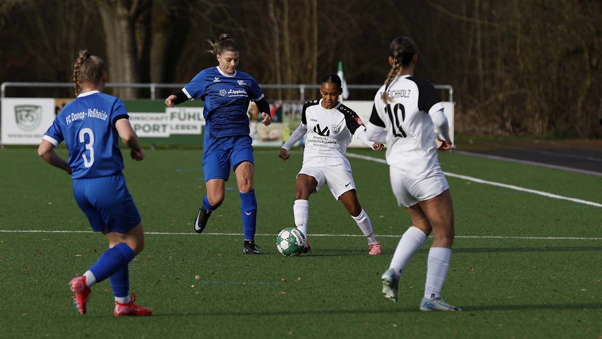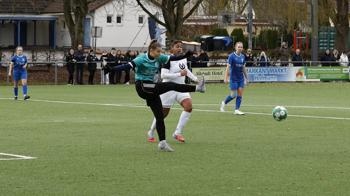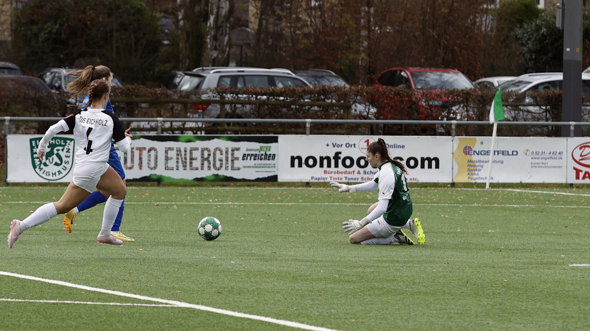 Die Herbstmeisterinnen aus Donop-Voßheide erwischten den besseren Start und gingen mit ihrem ersten vielversprechenden Angriff in Front. Dem Führungstreffer von Melanie Gutsch ging allerdings auch ein kapitaler Stellungsfehler in unserer zentralen Defensive voraus, so dass die Top Scorerin des FC blank vorm Tor auftauchte und ohne Mühe rechts unten einschoss. Nix zu halten für Anna-Maria Reher, die leider nach gerade einmal 5 absolvierten Minuten den Ball aus dem eigenen Netz holen musste. Allerdings stand sie im weiteren Spielverlauf mit hervorragenden Paraden noch mehrfach im Fokus des Geschehens, vereitelte etliche hochkarätige Einschusschancen der Gäste.