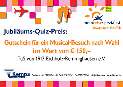 Als aktiver Sportler im TuS hast Du ja sicher bereits die bisherigen 5 Quizkarten gesammelt. Die letzte Karte erhältst Du auf der „TuS-Aktiv-Meile“ am Samstag, den 2. Juni auf dem „Großen Festwochenende“ an der Lostrommel.